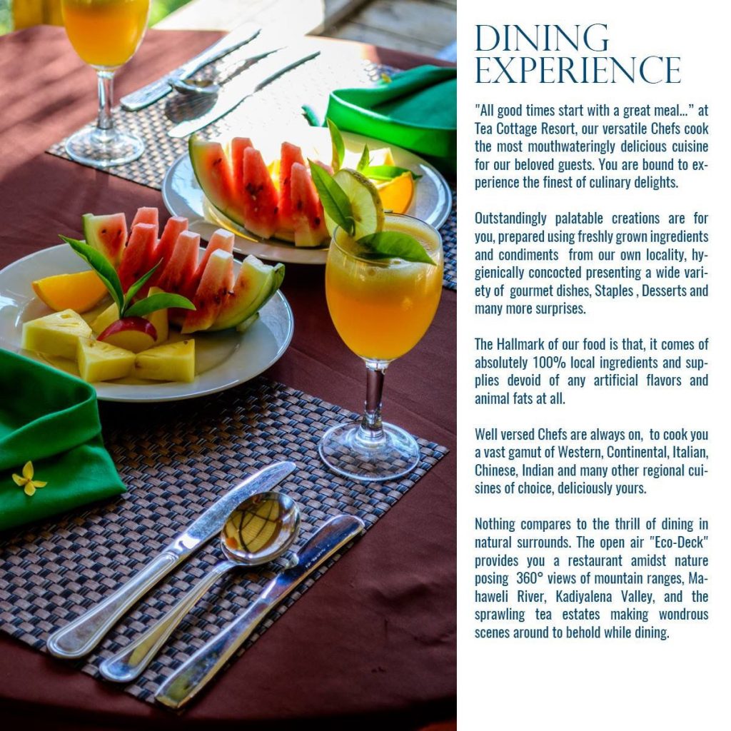 The environmental temperature at The Tea Cottage Resort remain at 20°-25c° Celsius throughout the year making it a place where one can relax in a refreshing climate and peaceful surroundings. Sunny weather is prevalent mostly during the year with occasional rains in between.