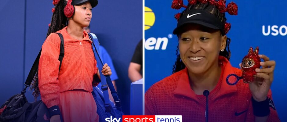 Naomi Osaka explained how her sparkling outfit came together and showed off her new mascot for the US Open as well as giving her opinion on Carlos Alcaraz’s new haircut.