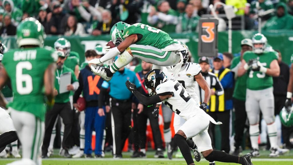 Watch Philadelphia Eagles running back Saquon Barkley hurdle a defender backwards in an incredible play from last season.