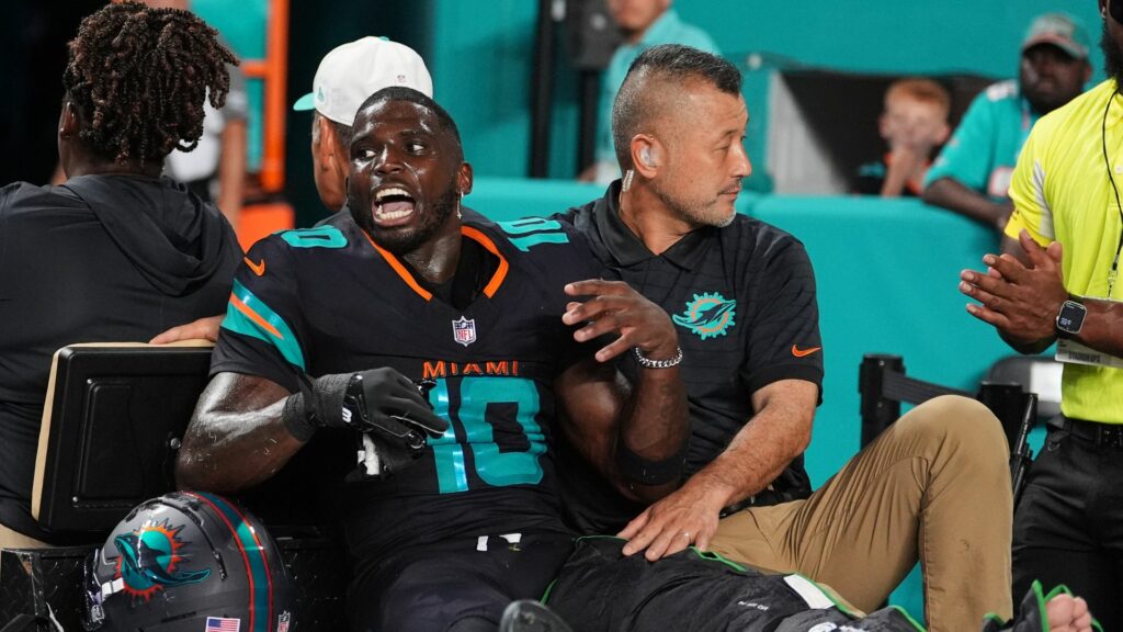 Miami Dolphins’ Tyreek Hill was hospitalised overnight and had scans on a ‘dislocated knee’ during the 27-21 win over the New York Jets.