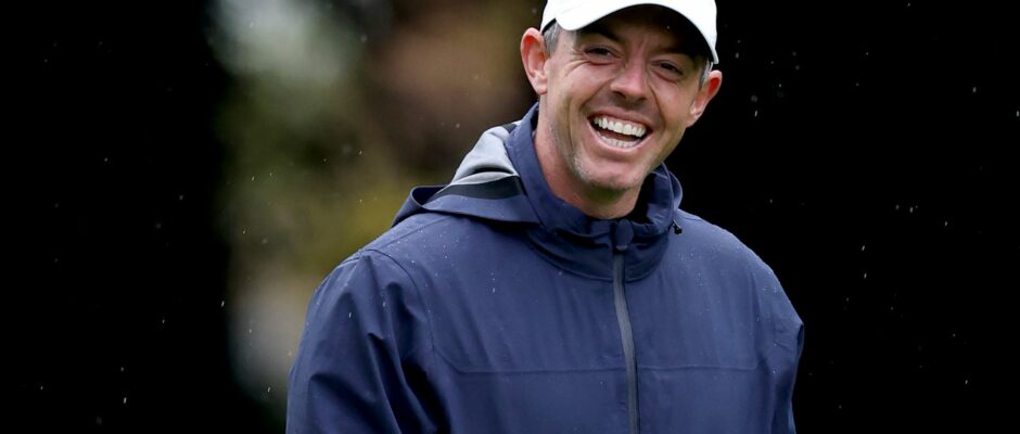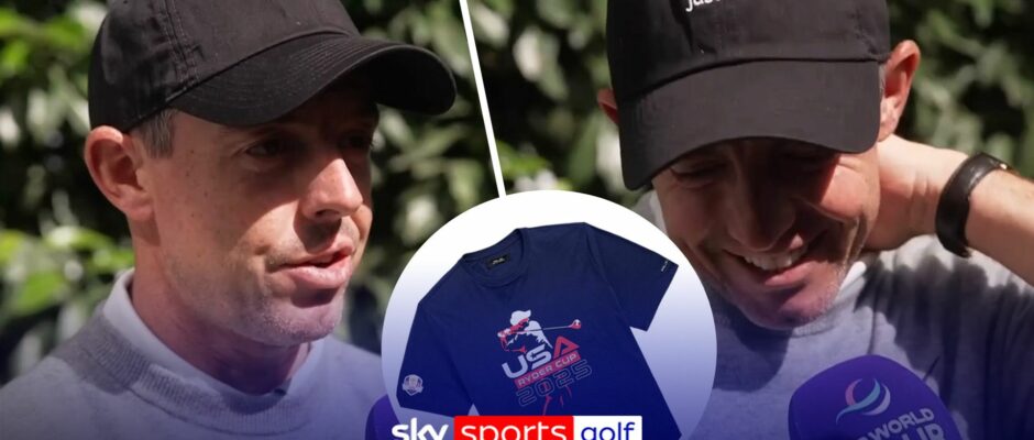 Rory McIlroy speaks to Sky Sports’ Jamie Weir as he looks ahead to the Ryder Cup at the end of September and reacts to a US Ryder Cup tee-shirt that looks like a silhouette of him.