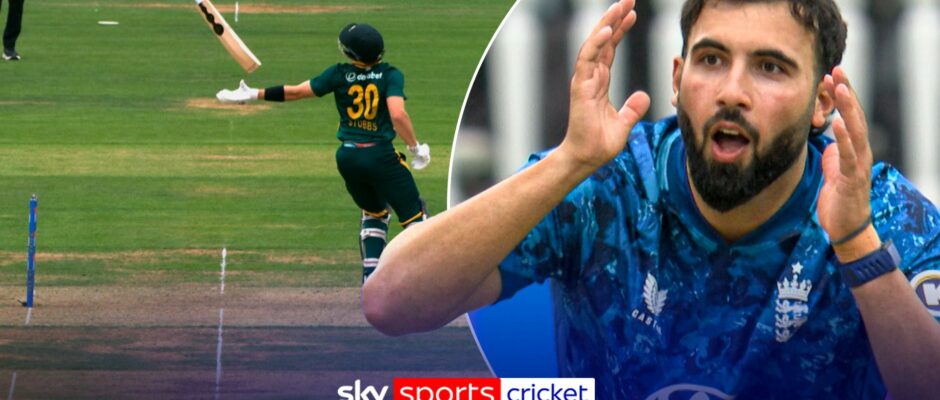 South Africa’s Tristan Stubbs loses grip of his bat, which almost hits his own stumps, before he dives back to stop it.