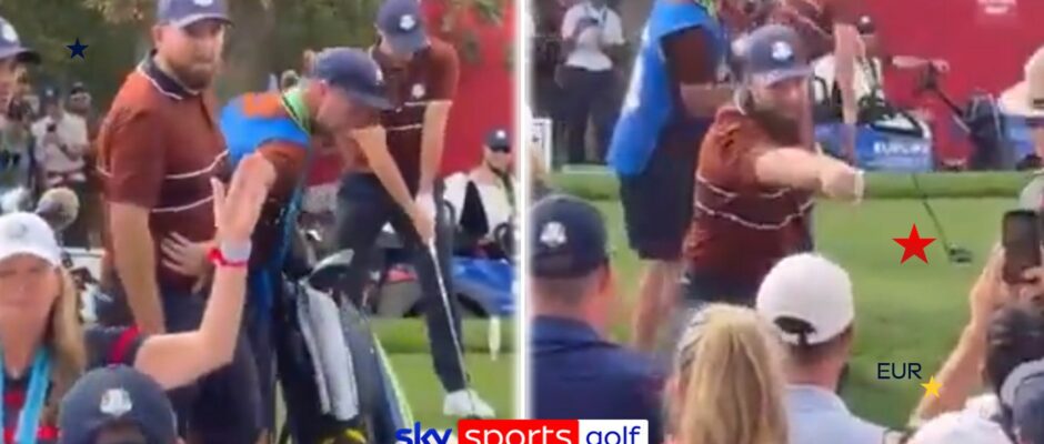 Shane Lowry was seen being held back by his caddie as he tried to confront someone heckling Rory McIlroy at the Ryder Cup!
