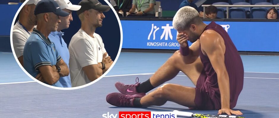 Carlos Alcaraz appeared to argue with his team management for continuing to play despite a suspected ankle injury during his Japan Open clash against Sebastian Baez.