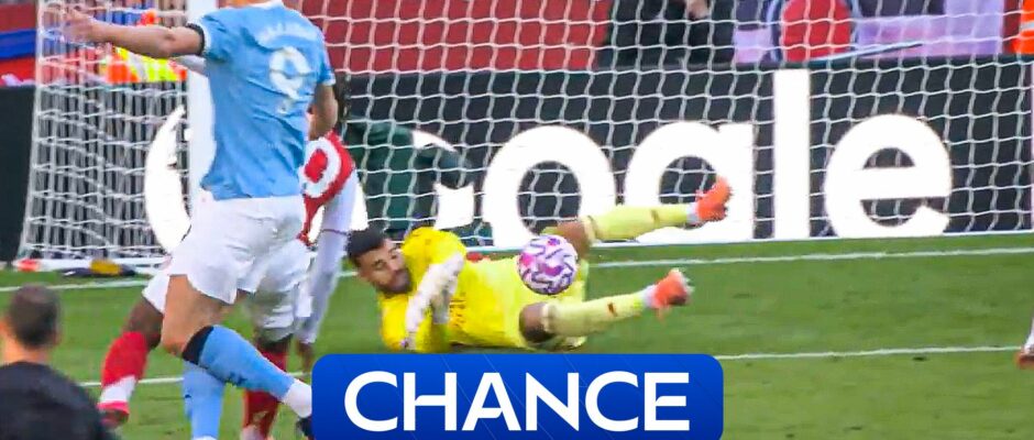 Erling Haaland takes another shot for Man City but Arsenal stopper David Raya makes the save.