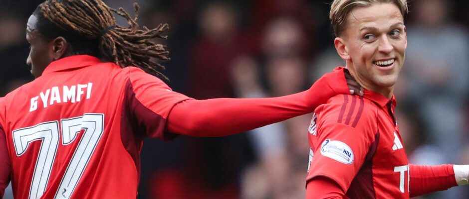 Jesper Karlsson scored twice as Aberdeen thrashed Dundee 4-0 to record a long-awaited first Premiership win of the campaign.