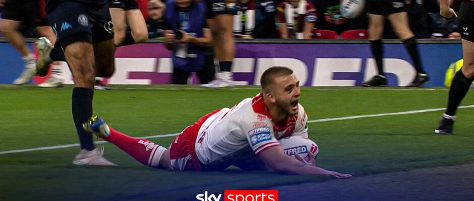 Mikey Lewis opens the scoring for Hull KR in the Super League Grand Final against Wigan Warriors.